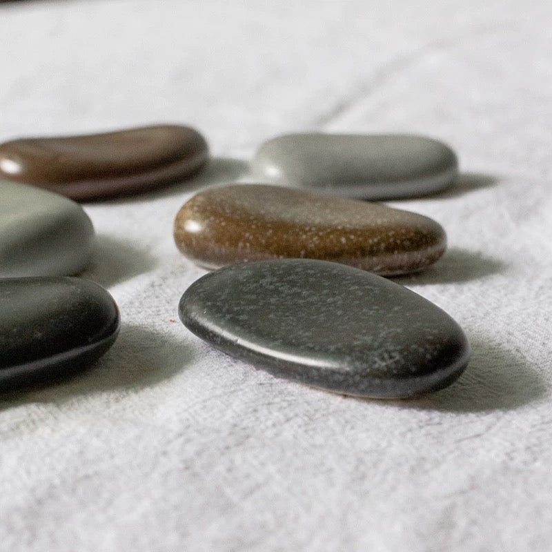 This set of pebble-like cutlery rests features smooth, rounded stones in a range of earthy tones, including soft greys, deep browns, and subtle metallic hues. Each piece mimics the organic beauty of natural stones, creating a calming, minimalist aesthetic that enhances any dining experience. The smooth, polished surface adds a refined touch to your table, offering both practical use and visual appeal.